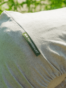 Dyskretnym, ale charakterystycznym dla nas akcentem, jest niewielka, tkana metka w kolorze oliwkowej zieleni z logo KOMBINATu, precyzyjnie wszyta w jeden z rogów.